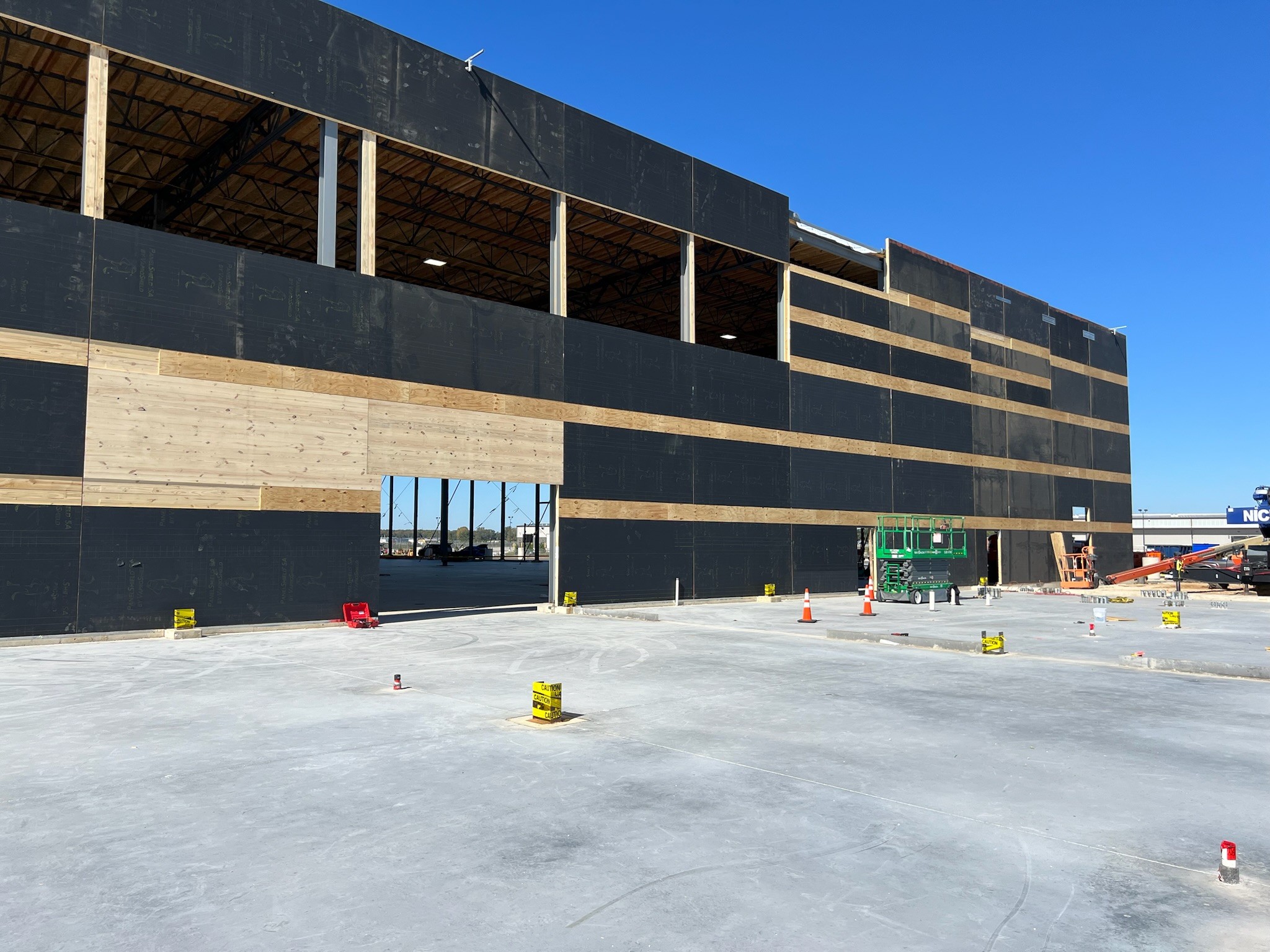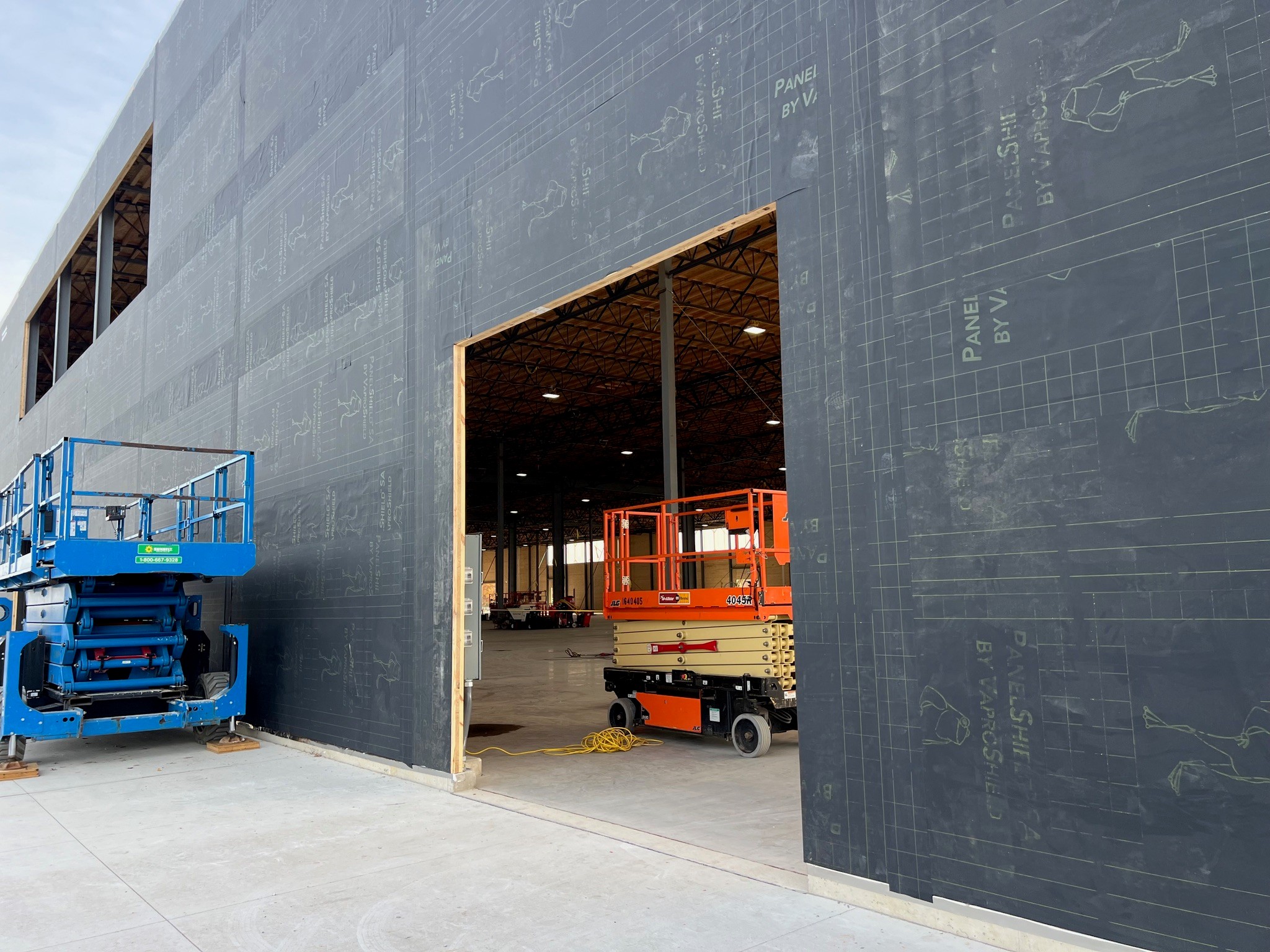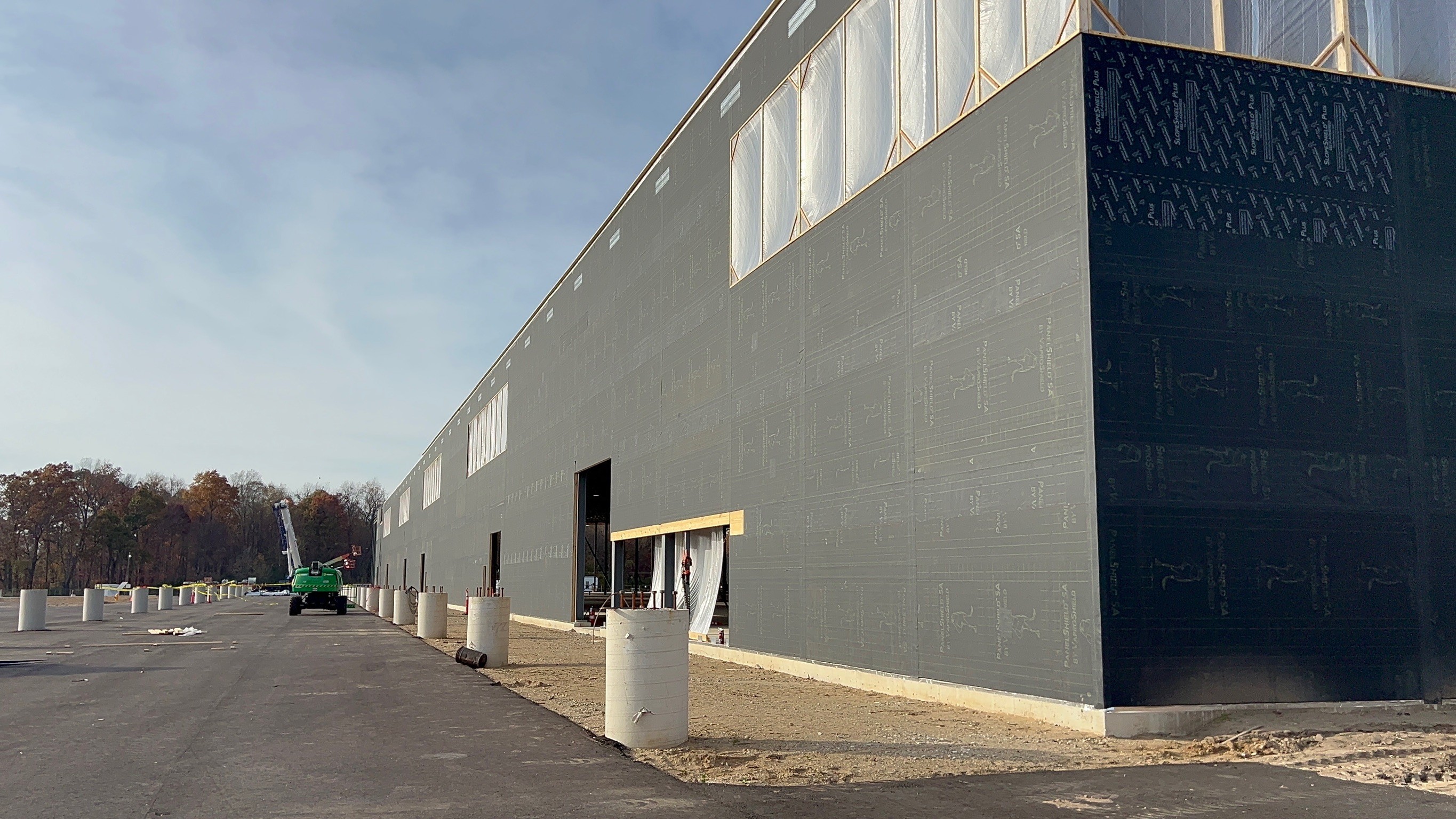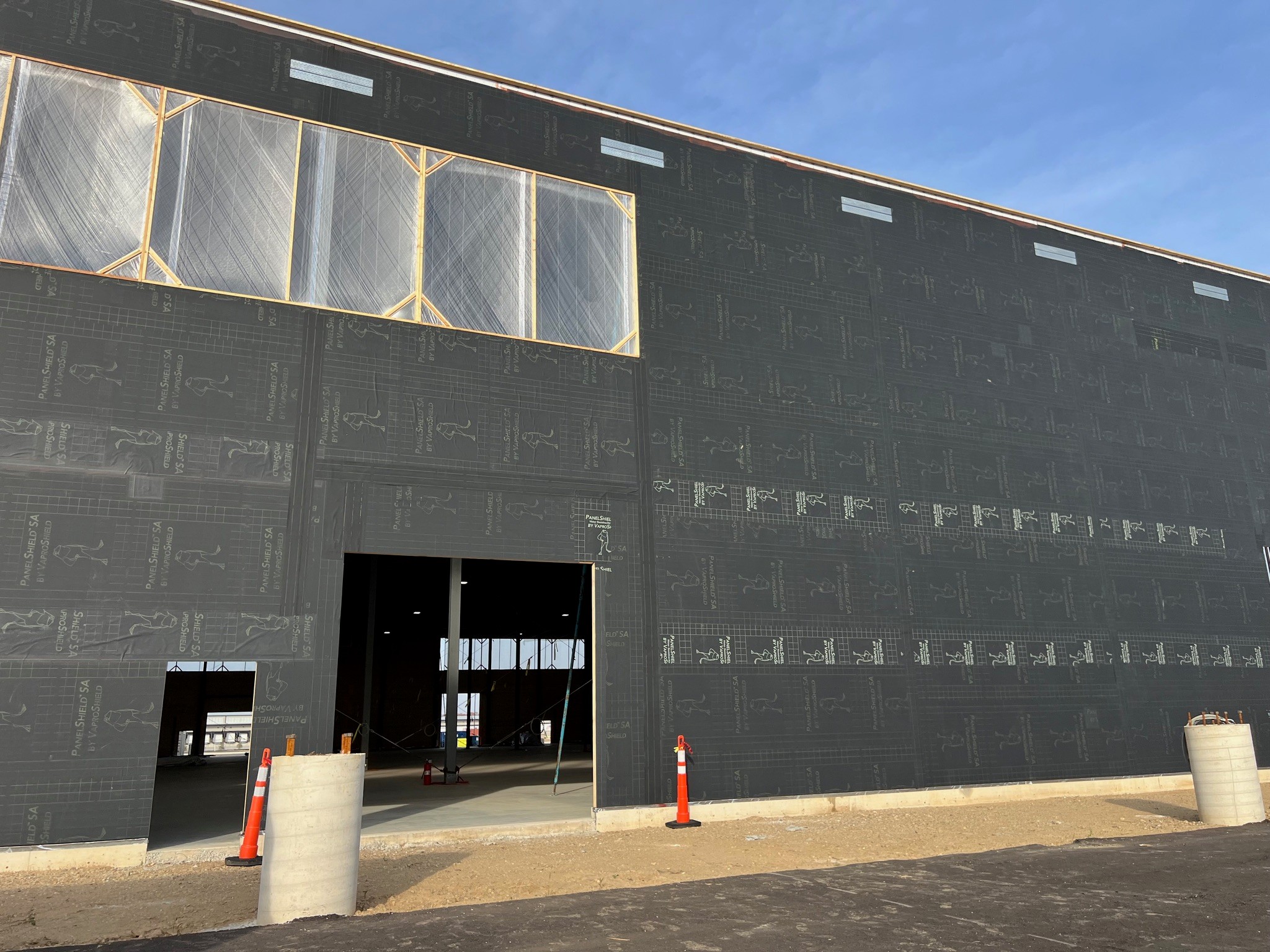 The Amazon DII5 delivery station features a mass timber structure including glulam beams and cross-laminated timber panels, creating a low-carbon, sustainable facility. Over 75,000 sq.ft. of PanelShield SA was installed on the mass timber walls to provide a fully adhered, vapor-permeable air barrier. An additional 60,000 sq.ft. of SlopeShield Plus SA was installed on the awnings of the facility.