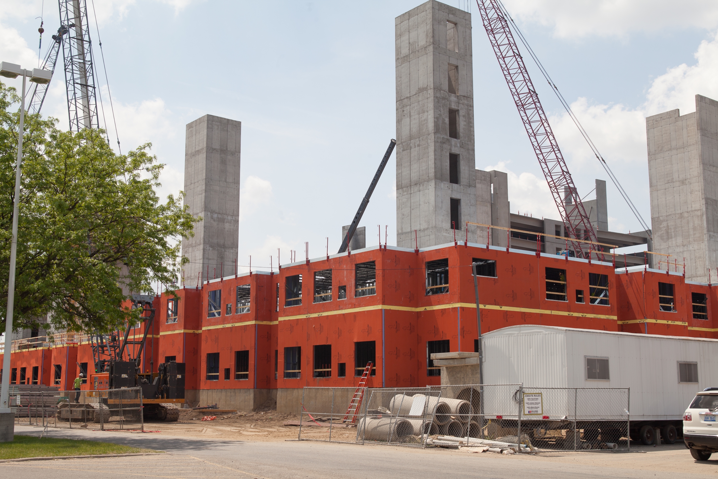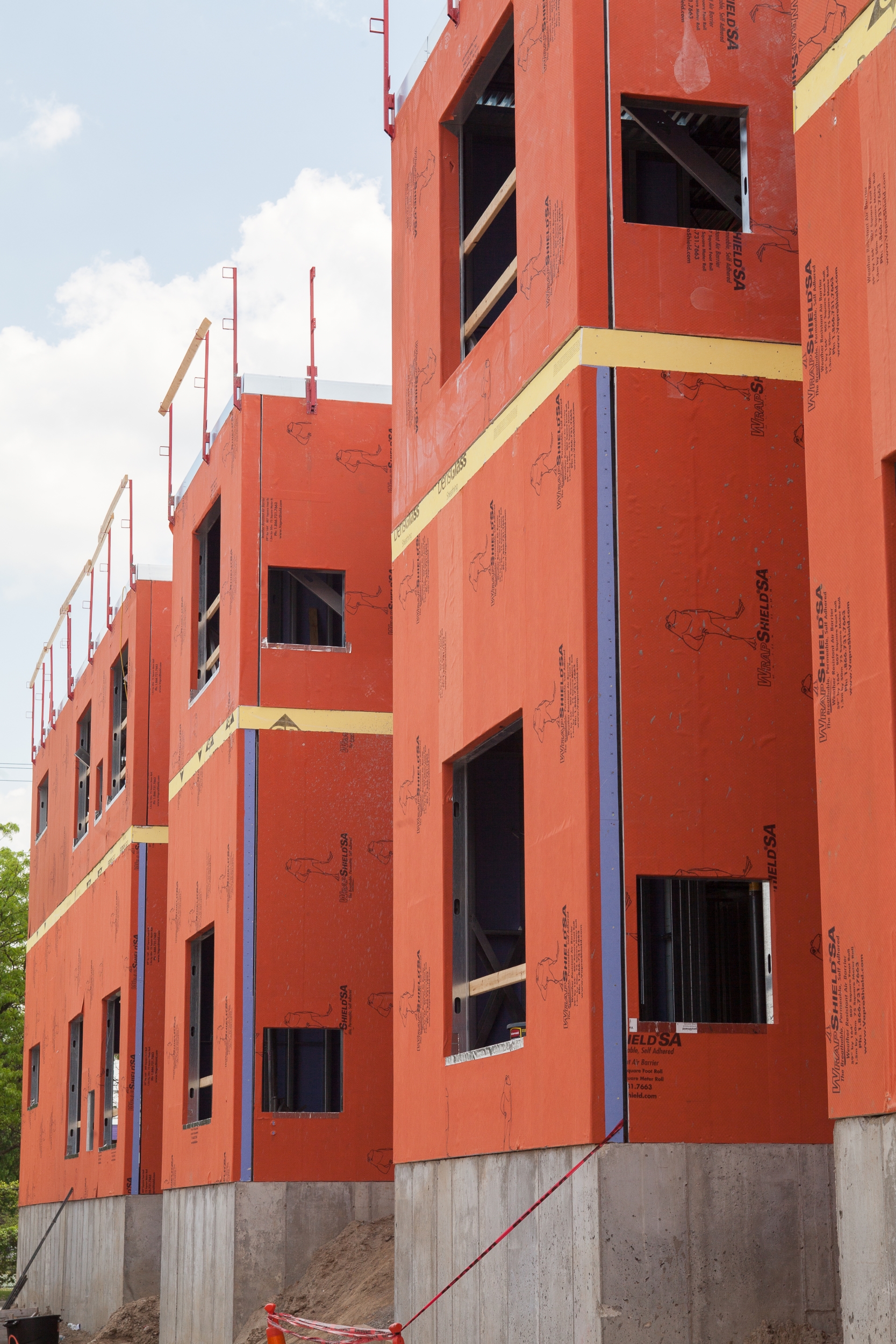 WrapShield SA Self-Adhered WRB/Air Barrier panels (orange) are being installed on the Skyvue Apartments in Lansing, MI.